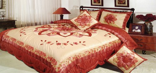 Puffed detailed medallion center flower with 3 tiers of floral and striped, and heart shaped/semi-circle skirted bottom panel ruche. Comforter sets are designed to keep you updated and fashionable in the most convenient and inexpensive way. Comforter set includes: One comforter, two shams, two cushion covers. Also it could be dry clean or machine wash warm, tumble tumble dry gentle/ low or drip dry, and use mild detergent and no bleach.