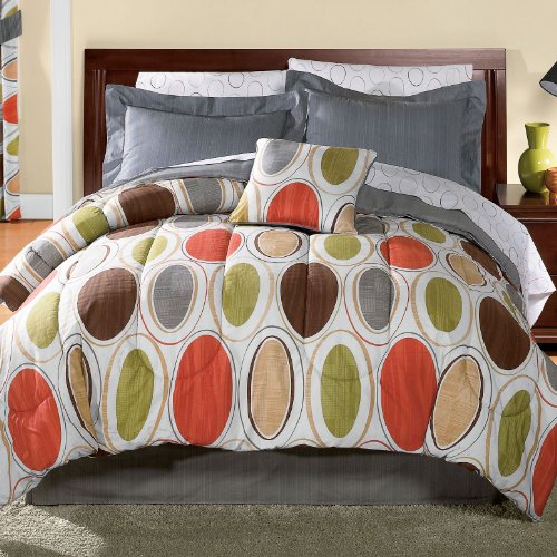 This bright and bold print oversized comforter set offers an oval design in orange, green and taupe on one side and a grey stripe on the other. Machine wash. 100% cotton. Imported. Extra-long and extra wide so it's perfect for thicker deeper mattresses and plenty of coverage Oversized to drape beautifully across your bed Fitted sheet fits mattresses up to 16" Oversized comforter set includes an oversized polyfilled comforter, bedskirt, 2 standard shams (1 with twin, 2 king with king), 4-piece sheet set (3-piece with twin) and 2 decorator pillows. Twin Set, 8 pcs., 66x86" Full Set, 10 pcs., 76x86" Queen Set, 10 pcs., 90x90" King Set, 10 pcs., 104x90" Also available separately: Valance, 84"Wx18"L