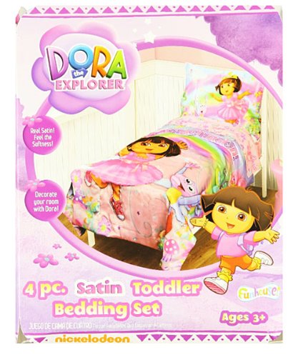 The super soft bedding features a fun pink Dora the Explorer print.4-Piece Set includes:(1) Flat top sheet(1) Quilted bedspread(1) Standard pillowcase(1) Fitted bottom sheet (fits standard crib mattress)100% polyesterMachine washableImported